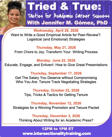 “My goal in this series is to help academic outsiders across their student and professional careers understand and succeed in U.S. universities through transparent strategies for achieving their goals while fostering joy & wellness in themselves.”—Jennifer M. Gómez https://www.intersectionalitytraining.com/training/tried-and-true/