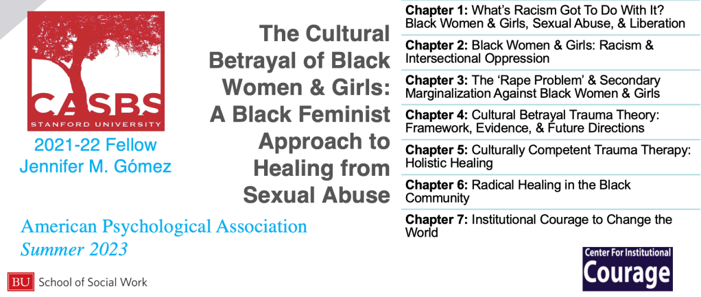 Gómez’ plan for the CASBS Fellowship Year is to write her first academic book: The Cultural Betrayal of Black Women & Girls: A Black Feminist Approach to Healing from Sexual Abuse (Publisher: American Psychological Association; 2023).
